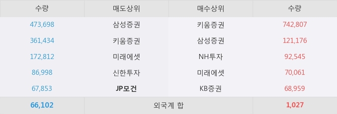 거래원 동향은 JP모건, 삼성증권, 미래에셋 등이 매도 상위 목록에 나타나고 있다.