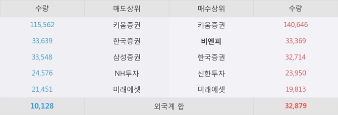 거래원 동향은 비엔피, 미래에셋이 매수 상위 목록에 나타나고 있다.