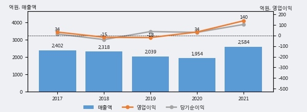 최근 실적을 살펴보면 2021년 매출액이 최근 5년 중 가장 높은 실적을 기록했음을 알 수 있다. 이전 최고 실적이었던 2017년 보다도 7.6%(182억 1천만원) 늘어난 것으로 나타났다.