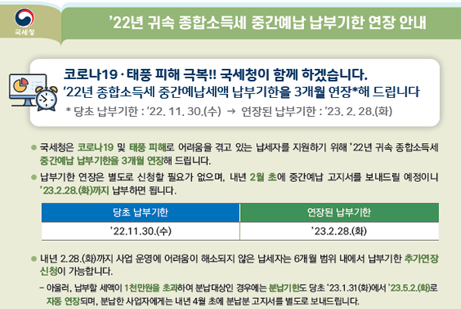 국세청(청장 김창기)은 6일 코로나19 손실보상 대상자(2022. 1분기), 태풍 힌남노 피해지역 납세자(9만3000명, 2,793억 원)의 중간예납 납부기한을 내년 2월 말까지 3개월 직권연장한다고 밝혔다.