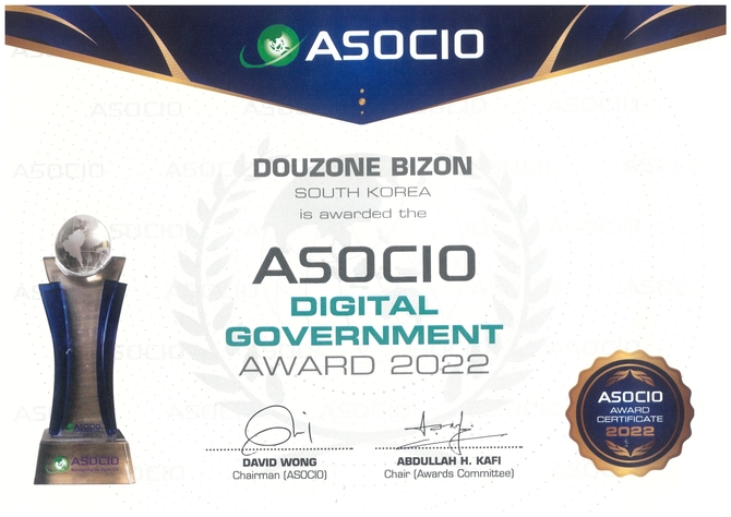 ASOCIO는 2016년부터 매년 회원국 가운데 ICT 혁신과 발전에 기여한 기업 및 기관을 선정, 4개 부문에 시상하고 있다. 더존비즈온은 강원도 디지털 통합 행정플랫폼인 ‘우리도’의 개발·서비스를 통해 대국민 공공서비스의 질을 향상하고 공공 복지・행정의 맞춤형 서비스 확산에 기여한 점을 인정받아 Digital Government 부문상을 수상했다.