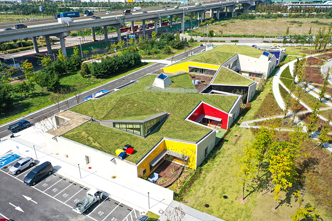 CJ대한통운 건설부문이 시공한 하나금융그룹 공동 직장 어린이집은 지난 2021년 8월 인천 청라 하나드림타운 내에 준공됐다. 설계를 한 이손건축건축사사무소 측은 종이접기를 하면 만들어지는 굴곡진 형태에서 따온 작은 동산 모티브를 적용해 18개의 보육실과 10개의 마당, 2개의 작은 동산을 구현했다.