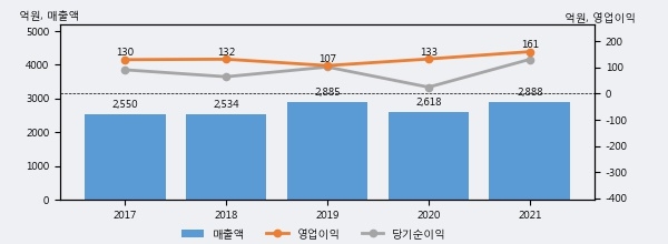 최근 실적을 살펴보면 2021년 매출액이 최근 5년 중 가장 높은 실적을 기록했음을 알 수 있다. 이전 최고 실적이었던 2019년 보다도 0.1%(2억 5천만원) 늘어난 것으로 나타났다.