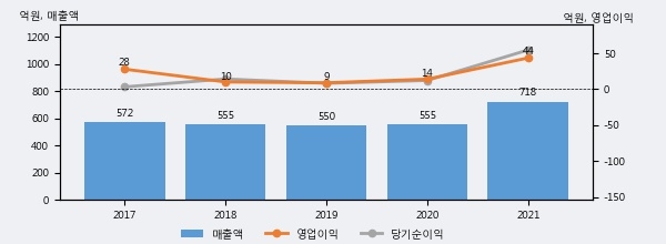 최근 실적을 살펴보면 2021년 매출액이 최근 5년 중 가장 높은 실적을 기록했음을 알 수 있다. 이전 최고 실적이었던 2017년 보다도 25.5%(145억 9천만원) 늘어난 것으로 나타났다.