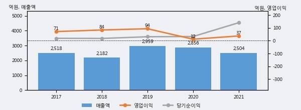 세진중공업의 2021년 매출액은 전년대비 -12.3% 줄어든 2504억원이고, 영업이익은 전년대비 215.3% 늘어난 37억원을 기록했다. 이 회사의 매출액 증감률과 영업이익 증감률은 각각 코스피 하위 6%, 상위 14%에 해당된다.