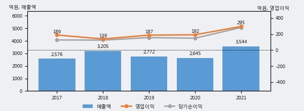 최근 실적을 살펴보면 2021년 매출액이 최근 5년 중 가장 높은 실적을 기록했음을 알 수 있다. 이전 최고 실적이었던 2018년 보다도 10.6%(339억 4천만원) 늘어난 것으로 나타났다.
