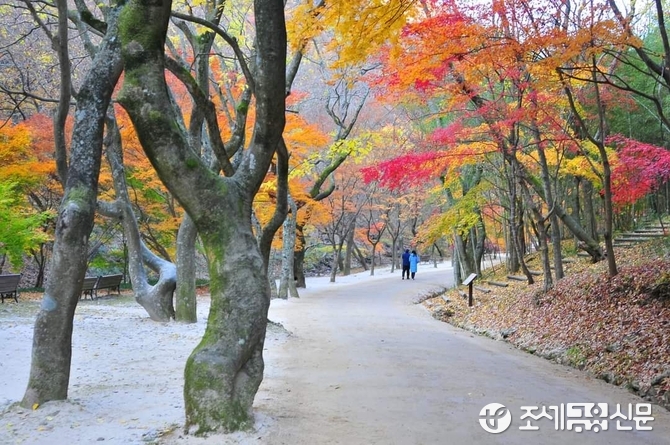 8km에 이르는 강천산 계곡 중 병풍폭포에서 구장군폭포 사이 계곡에 위치한 왕복 5km의 맨발 산책로와 목재 데크 산림욕장을 따라 오색단풍길이 관광객들을 매료시키고 있다.