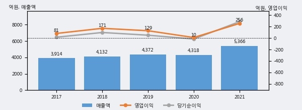최근 실적을 살펴보면 2021년 매출액이 최근 5년 중 가장 높은 실적을 기록했음을 알 수 있다. 이전 최고 실적이었던 2019년 보다도 22.8%(994억 8천만원) 늘어난 것으로 나타났다.