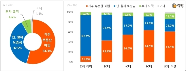 연령별로는 20~30대는 '전‧월세 보증금' 목적이 가장 많았고, 40대 이상은 '거주 부동산 매입' 비중이 높았다.