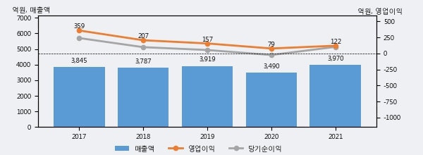 최근 실적을 살펴보면 2021년 매출액이 최근 5년 중 가장 높은 실적을 기록했음을 알 수 있다. 이전 최고 실적이었던 2019년 보다도 1.3%(51억 1천만원) 늘어난 것으로 나타났다.