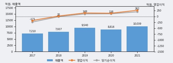 최근 실적을 살펴보면 2021년 매출액이 최근 5년 중 가장 높은 실적을 기록했음을 알 수 있다. 이전 최고 실적이었던 2019년 보다도 5.2%(498억 9천만원) 늘어난 것으로 나타났다.