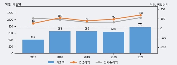최근 실적을 살펴보면 2021년 매출액이 최근 5년 중 가장 높은 실적을 기록했음을 알 수 있다. 이전 최고 실적이었던 2019년 보다도 17.7%(116억원) 늘어난 것으로 나타났다.