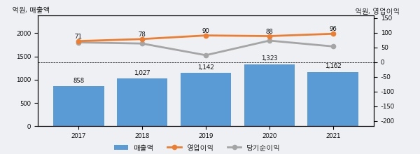 대아티아이의 2021년 매출액은 전년대비 -12.1% 줄어든 1162억원이고, 영업이익은 전년대비 8.8% 늘어난 96억원을 기록했다. 이 회사의 매출액 증감률과 영업이익 증감률은 각각 코스닥 하위 14%, 하위 45%에 해당된다.