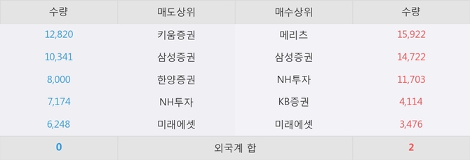 거래원 동향은 메리츠, 삼성증권, NH투자 등이 매수 상위 목록에 나타나고 있다.