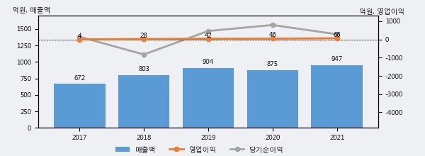 최근 실적을 살펴보면 2021년 매출액이 최근 5년 중 가장 높은 실적을 기록했음을 알 수 있다. 이전 최고 실적이었던 2019년 보다도 4.7%(42억 8천만원) 늘어난 것으로 나타났다.