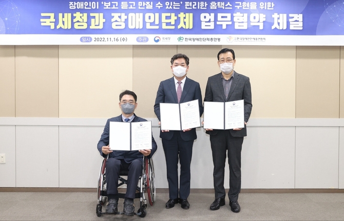이날 국세청은 한국장애인단체총연맹 및 한국장애인단체총연합회와 편의기능 제안‧사전 테스트 등 장애인 접근성을 높이기 위한 업무협약을 체결했다.