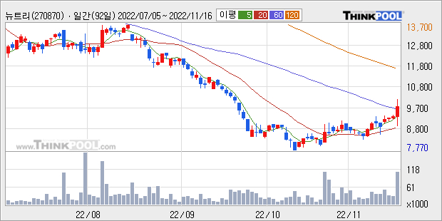 뉴트리는 2021년 매출액 2475억원과 영업이익 208억원을 기록했다. 전년대비 매출은 30.2% 상승했고, 영업이익은 -11.5% 하락했다. 이 회사의 매출액 증감률과 영업이익 증감률은 각각 코스닥 상위 26%, 하위 35%에 해당된다.