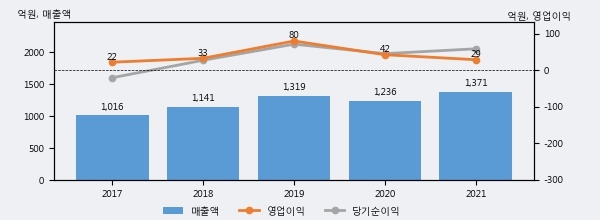 최근 실적을 살펴보면 2021년 매출액이 최근 5년 중 가장 높은 실적을 기록했음을 알 수 있다. 이전 최고 실적이었던 2019년 보다도 4.0%(52억 3천만원) 늘어난 것으로 나타났다.