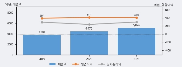 최근 실적을 살펴보면 2021년 매출액이 최근 3년 중 가장 높은 실적을 기록했음을 알 수 있다. 이전 최고 실적이었던 2020년 보다도 13.4%(600억원) 늘어난 것으로 나타났다.