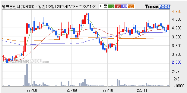 웰크론한텍의 2021년 매출액은 전년대비 33.8% 늘어난 2692억원이고, 영업이익은 적자전환해서 -2억원을 기록했다. 이 회사의 매출액 증감률과 영업이익 증감률은 각각 코스닥 상위 23%, 하위 15%에 해당된다.