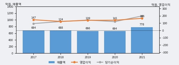 최근 실적을 살펴보면 2021년 매출액이 최근 5년 중 가장 높은 실적을 기록했음을 알 수 있다. 이전 최고 실적이었던 2018년 보다도 13.2%(90억 7천만원) 늘어난 것으로 나타났다.