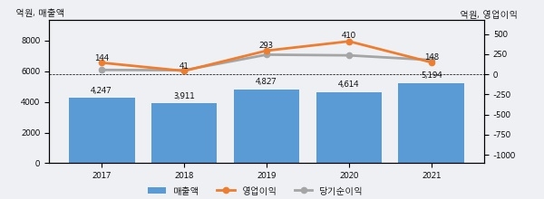 최근 실적을 살펴보면 2021년 매출액이 최근 5년 중 가장 높은 실적을 기록했음을 알 수 있다. 이전 최고 실적이었던 2019년 보다도 7.6%(367억 5천만원) 늘어난 것으로 나타났다.