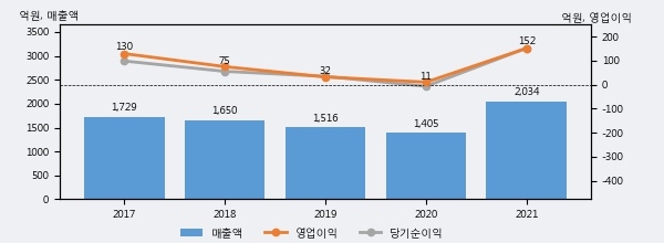 최근 실적을 살펴보면 2021년 매출액이 최근 5년 중 가장 높은 실적을 기록했음을 알 수 있다. 이전 최고 실적이었던 2017년 보다도 17.7%(305억 4천만원) 늘어난 것으로 나타났다.