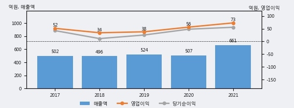 최근 실적을 살펴보면 2021년 매출액이 최근 5년 중 가장 높은 실적을 기록했음을 알 수 있다. 이전 최고 실적이었던 2019년 보다도 26.2%(137억원) 늘어난 것으로 나타났다.