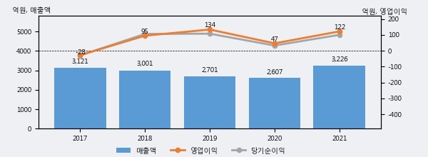 최근 실적을 살펴보면 2021년 매출액이 최근 5년 중 가장 높은 실적을 기록했음을 알 수 있다. 이전 최고 실적이었던 2017년 보다도 3.4%(105억 2천만원) 늘어난 것으로 나타났다.