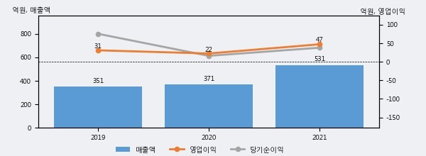 최근 실적을 살펴보면 2021년 매출액이 최근 3년 중 가장 높은 실적을 기록했음을 알 수 있다. 이전 최고 실적이었던 2020년 보다도 43.0%(159억 5천만원) 늘어난 것으로 나타났다.