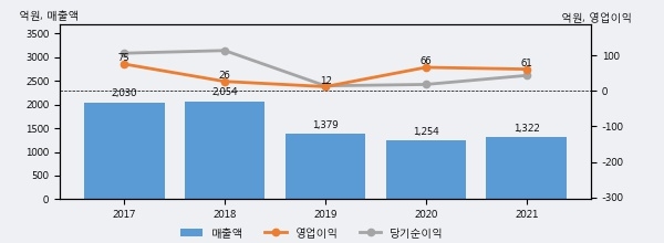 무림SP의 2021년 매출액은 전년대비 5.4% 늘어난 1322억원이고, 영업이익은 전년대비 -7.7% 줄어든 61억원을 기록했다. 이 회사의 매출액 증감률과 영업이익 증감률은 각각 코스닥 하위 35%, 하위 37%에 해당된다.