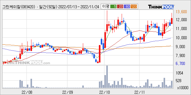 차트상 주가의 흐름은 현재 단기·중기 이평선이 정배열 상태로 전형적인 상승세를 보이고 있다. 이 종목의 차트에서 최근에 최근 60일 매물대 돌파, 최근 5일 매물대 돌파 등을 확인할 수 있다