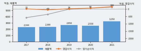 최근 실적을 살펴보면 2021년 매출액이 최근 5년 중 가장 높은 실적을 기록했음을 알 수 있다. 이전 최고 실적이었던 2019년 보다도 22.3%(593억 5천만원) 늘어난 것으로 나타났다.