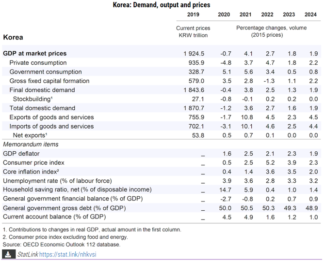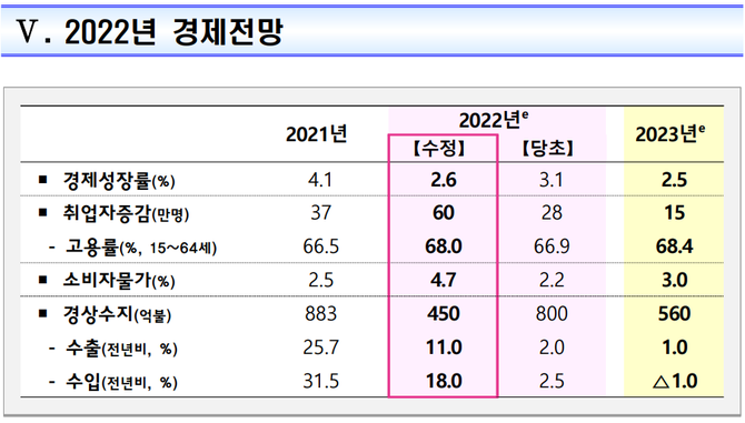 올해 한국 실질 경제성장 전망은 2.6%로 2021년 4.1%보다 1.5%p 떨어졌다. 정부도 수출, 수입, 경상수지 모두 줄 하향 전망을 내렸다.