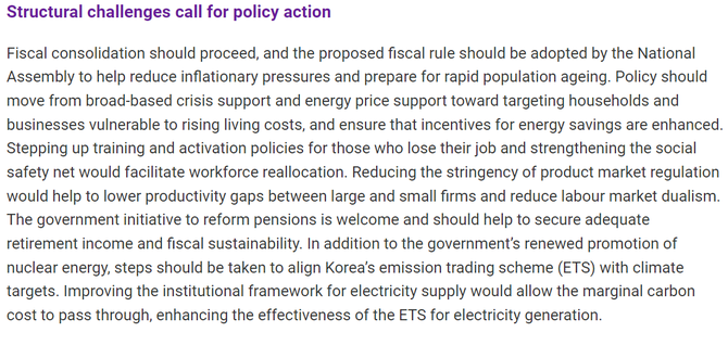 소득이 줄고 주택시장은 침체되며, 민간 소비와 투자는 동력을 잃을 것입니다. 실업률은 당분간 낮은 수준에서 증가하겠지만, 물가는 높게 유지될 것입니다. 긴축재정을 유지하시되 취약계층을 지원하고, 에너지 절약에 대한 인센티브를 주십시오. 사회안전망을 강화하고, 연금을 개혁하며, 대-중소기업간 격차를 줄이기 위한 시장개선이 필요합니다(전문 일부 편집).