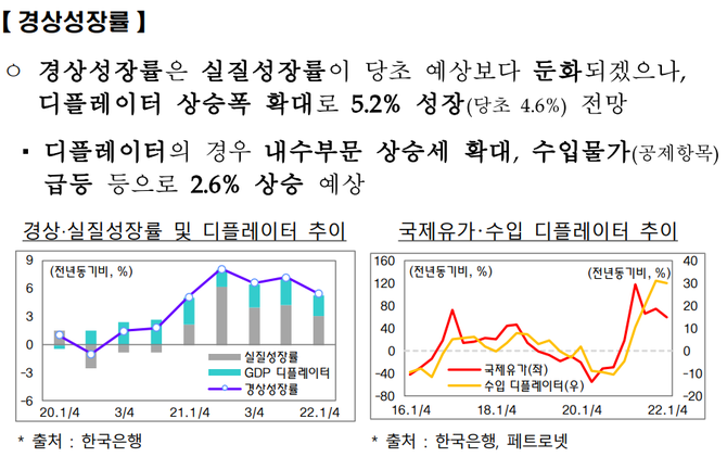 윤석열 대통령 취임 직후였던 6월 19일 발표한 새정부 경제정책을 보면 정부는 올해 경상성장률을 초기 전망 4.6%에서 5.2%로 대폭 상향전망했다. 러시아-우크라이나 전쟁으로 공급망 위기가 발발하고, 원유부터 시작해서 돼지고기, 밀, 옥수수 등 국제 식자재 물가가 펄쩍 뛰었다. 물가가 안 오를 이유가 없었다.