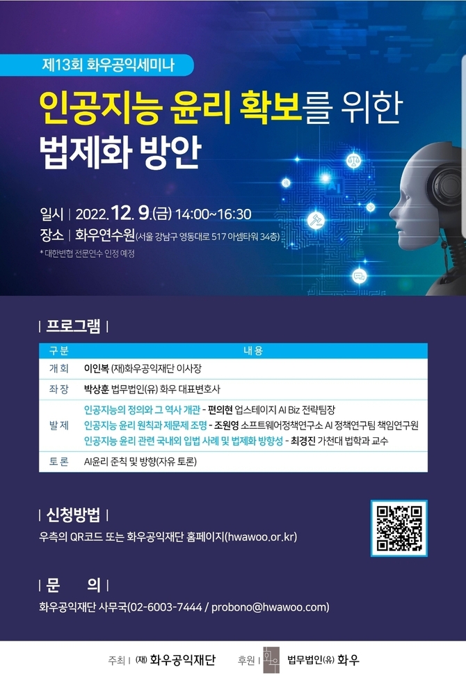 (조세금융신문=김영기 기자) 재단법인 화우공익재단(이사장 이인복)이 오는 9일, ‘인공지능 윤리 확보를 위한 법제화 방안’을 주제로 제13회 공익세미나를 개최한다.