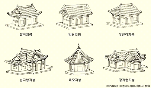 지붕은 기와로 지을 경우 팔작, 맞배, 우진각, 십자형, 육모, 정자형 등의 형태였다. 맞배지붕은 수덕사 대웅전, 무위사 극락보전, 선운사 대웅전, 화암사 극락전 등에서 볼 수 있다. 가장 오래된 수덕사 대웅전은 정면 3칸, 측면 4칸으로 정면보다 측면이 넓은 정사각형으로 황금비율을 이룬다.