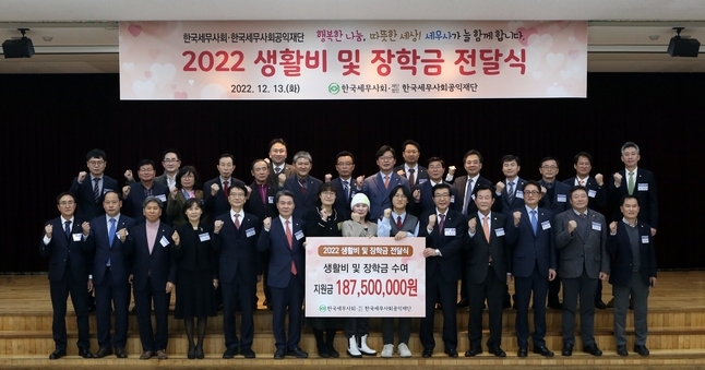 한국세무사회는 한국세무사회공익재단(이사장 정구정)과 공동으로 13일 오후 3시 서초동 한국세무사회관 6층 대강당에서 ‘2022년도 제10회 한국세무사회공익재단 생활비 및 장학금 전달식’을 개최하고 223명에게 총 1억 8750만 원의 생활비 및 장학금을 전달했다.