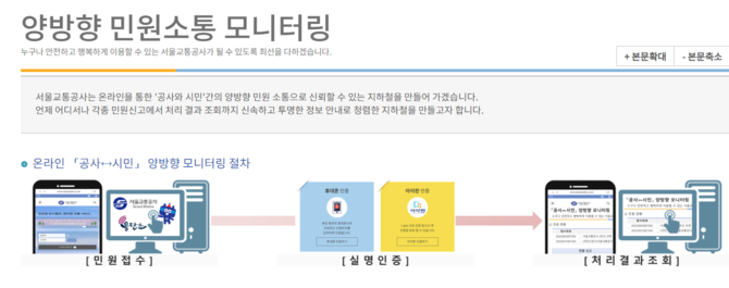 서울교통공사(이하, ‘공사’라 함.)는 공사 내 업무시스템과 연계하여 홈페이지 내 온라인「공사↔시민」‘양방향 민원 소통 모니터링’ 시스템을 12월부터 운영한다고 밝혔다.