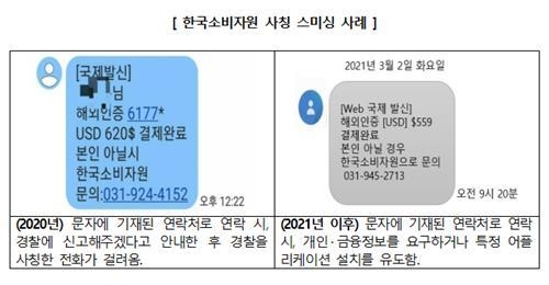 올해 9월까지 스미싱 문자 관련 상담이 4천여건 접수됐는데 '국제(해외) 발신' 문구가 적혀있거나 허위 해외 결제 내역을 한국소비자원에 문의하라며 거짓 연락처가 기재돼 있었다.