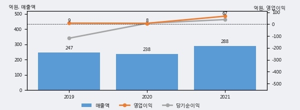 최근 실적을 살펴보면 2021년 매출액이 최근 3년 중 가장 높은 실적을 기록했음을 알 수 있다. 이전 최고 실적이었던 2019년 보다도 16.6%(41억원) 늘어난 것으로 나타났다.