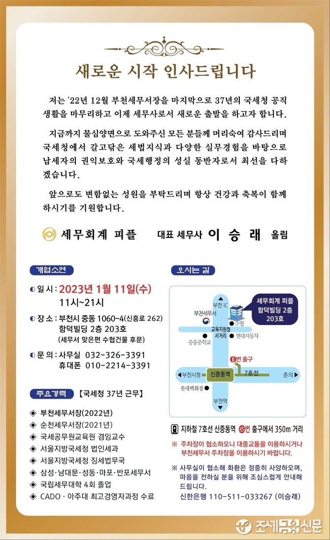 일본제국주의 치하 36년에 1년을 더 보탠 37년간 국세공무원으로, 2022년말까지 꽉 채우고 일하다가 마침내 두터운 관복을 벗은 이승래 전 부천세무서장이 세무사를 개업한다.