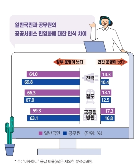 다만 공무원은 일반 국민보단 해당 공공서비스들을 정부가 운영하는 편이 낫다는 데 더 많이 동의하는 경향을 띄었다. 이들은 정부가 운영해야 한다는 의견으로 전력은 69.8%, 철도는 67%, 국공립병원은 63.1%가 동의했다.