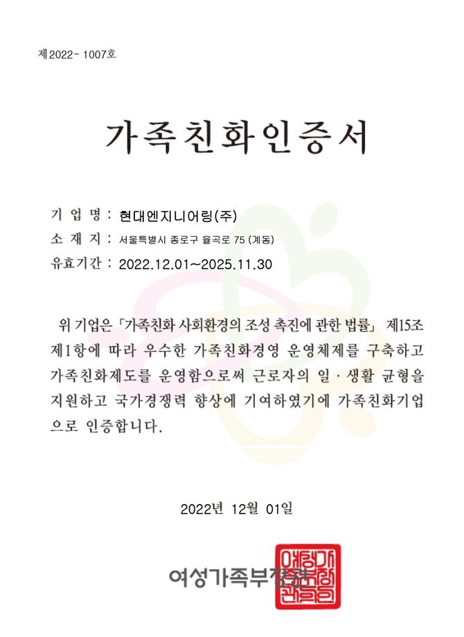 가족친화인증은 관련법에 따라 가족친화제도를 모범적으로 운영하는 기업을 심사를 거쳐 인증하는 제도다. 현대엔지니어링은 지난 2014년 가족친화기업인증을 처음 획득했다. 이번 재인증 심사를 포함, 총 세 번의 인증 과정을 통과하며 10년 연속 가족친화기업으로 인정받았다.