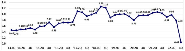 특히 2022년 4분기의 지가변동률은 0.04%에 불과해, 상승폭이 3분기(0.78%) 대비 0.74%p, 전년 같은 기간(1.03%) 대비 0.99%p씩 낮아진 것으로 나타났다.
