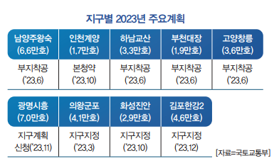 특히, 정비사업 활성화를 위한 제도개선(안전진단기준 개정('23.1), 재초환법 개정('23.上), 통합심의 의무화 등 도정법 개정('23.上))을 완료하고, '23년 중 신규 정비구역 4.8만호 지정 추진한다. 민간도심복합사업제도 기반을 마련('23.下, 도심복합법 제정)하고, 설명회 등을 통해 지자체 후보지 발굴‧선정 지원하며 공공시행 사업은 사업성 제고를 위한 제도 개선과 함께 신규 후보지 발굴 및 기존 후보지 지구지정(1만호) 추진한다.