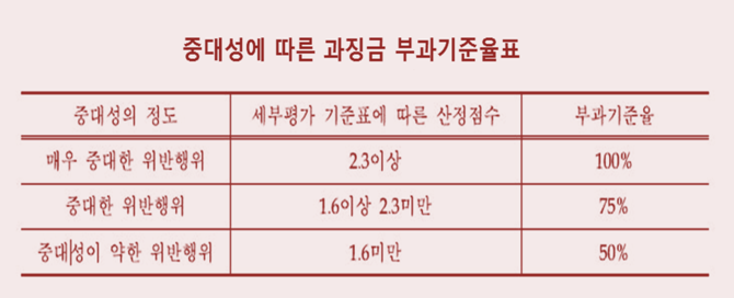'매우 중대한 위반행위'에 대해서는 부과기준율이 100% 적용되며, '중대한 위반행위'는 75%, '중대성이 약한 위반행위'에는 50%가 적용된다.