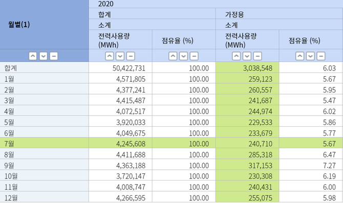 반면 전력 사용량은 5월과 10월 등 중간중간 수요가 줄어드는 시기가 있지만, 대체로 매월 사용량은 꾸준히 유지된다.