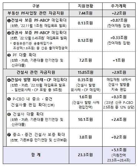 먼저 금융당국은 올해 부동산 PF와 건설사 관련 신용리스크 완화를 위해 지난해보다 5조1000억원 늘어난 총 28조4000억원을 지원한다. KDB산업은행과 IBK기업은행, 신용보증기금 등 정책 금융기관이 부동산 PF 사업장에 9조6000억원, 건설사 자금지원에 18조8000억원을 투입한다.